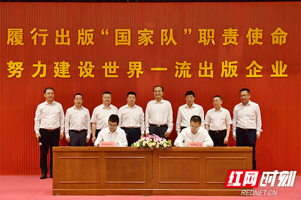 中國出版集團黨組成員、副總經(jīng)理陳永剛,中國出版集團黨組成員、中國出版?zhèn)髅焦煞萦邢薰靖笨偨?jīng)理茅院生,湖南出版集團黨委書記、董事長彭玻,湖南出版集團黨委副書記、副董事長、總編輯、總經(jīng)理楊壯,湖南出版集團黨委委員、分管日常工作的副總經(jīng)理舒斌出席簽約協(xié)議。